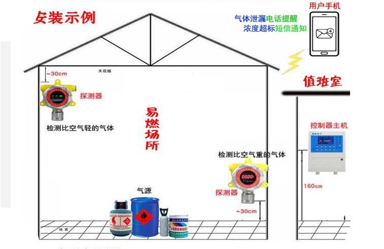 当工业环境、日常生活环境中可燃性气体发生泄漏时,有毒可燃气体报警器检测到可燃性气体浓度达到报警器设置的报警值时,可燃气体报警器会发出声光报警信号,以提醒工作人员疏散、强制排风、关停设备等安全措施。且气体报警器可联动相关的联动设备如在工厂生产、储运中发生泄漏,可以驱动排风、切断设备电源、喷淋等系统,防止发生爆炸、火灾、中毒事故,从而保证安全生产,此方案经常用在化工厂、石油、燃气站、钢铁厂等使用或者产出可燃性气体的场所。
